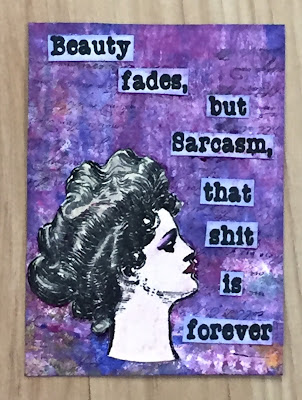 Marilyn has made a couple of ATC's using images from Gibson Girl Faces and some Carmen Veranda sentiments, My Greatest Accomplishment and Sarcasm is Forever.