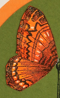 Stamp butterfly wings on scrap white cardstock. Color with Copic markers. Cut out. Add to skeletons shoulders.